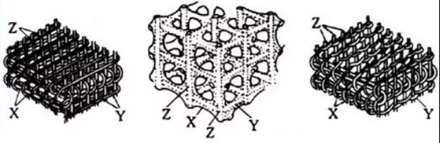首先,是復(fù)合材料的組成、構(gòu)造與加工問題。選取的基體是什么,增強(qiáng)相是以什么方式加入基體的以及增強(qiáng)相自身的分布和編織方式,如何加工和實現(xiàn)這種復(fù)合材料。復(fù)合材料的構(gòu)成結(jié)構(gòu)是多種多樣的,如下面圖示。有增強(qiáng)體無規(guī)則分散的,有纖維單向增強(qiáng)的,有以層合板的形式疊加的,有夾層結(jié)構(gòu)的,有三維編織的等等,不一而足,而且還會研究發(fā)展新的構(gòu)造形式。